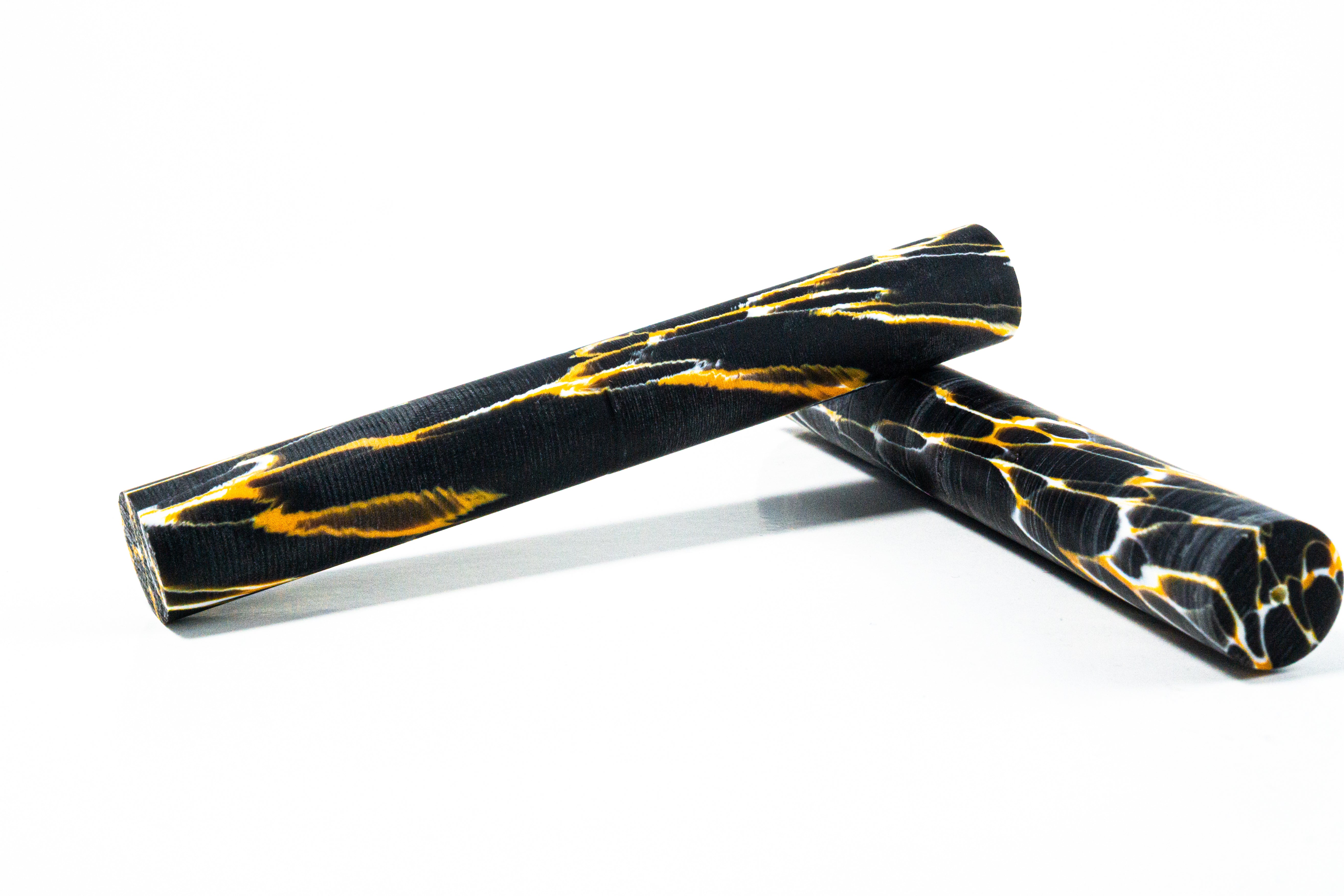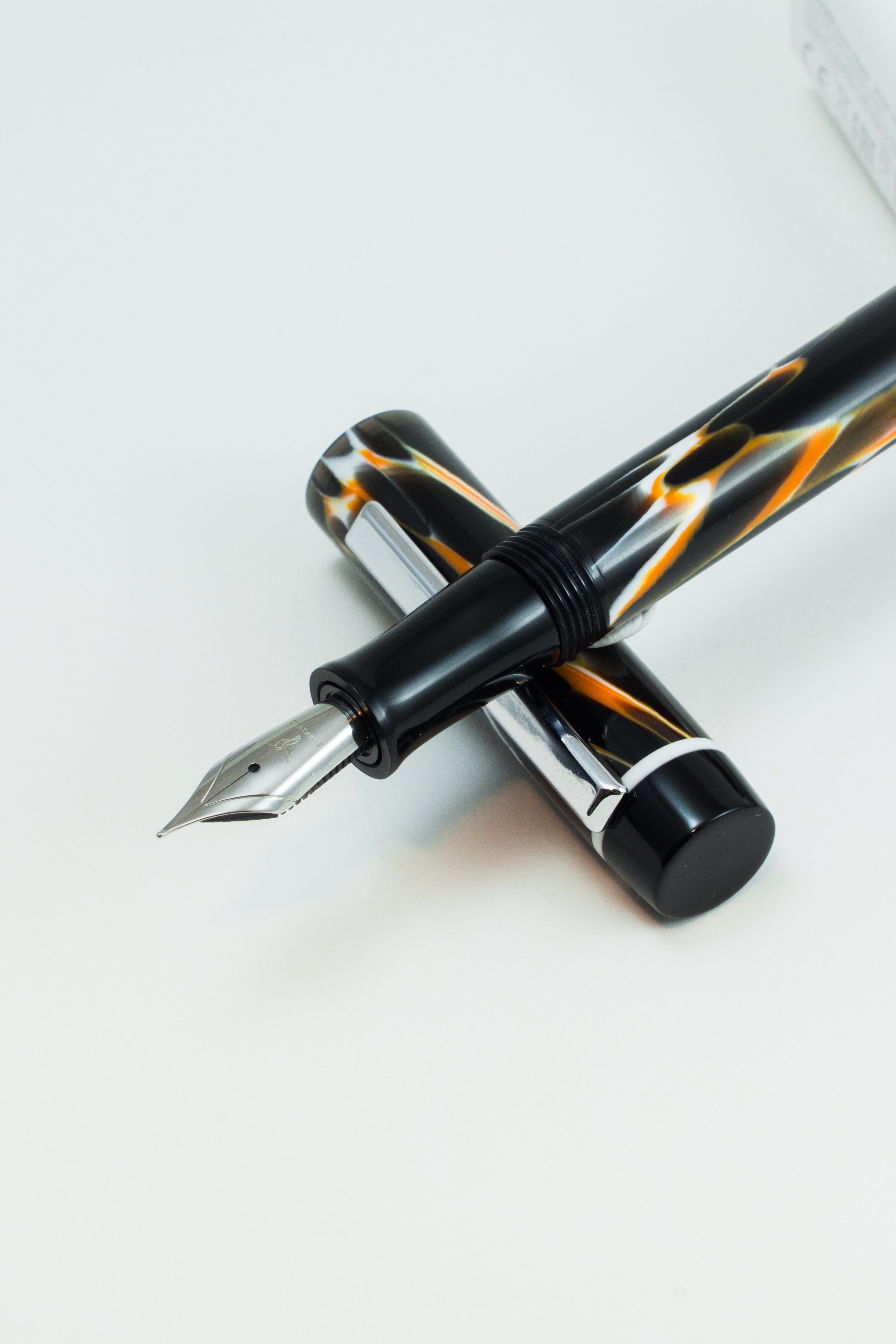 Ignite your creativity with Ember Glow, a pen that captures the fiery brilliance of glowing embers against the night. Its striking streaks of orange and white blaze across a bold black base, creating a dynamic, high-contrast design that demands attention. Topped with sleek black finials and complemented by a chrome clip, this pen exudes a modern yet timeless appeal.